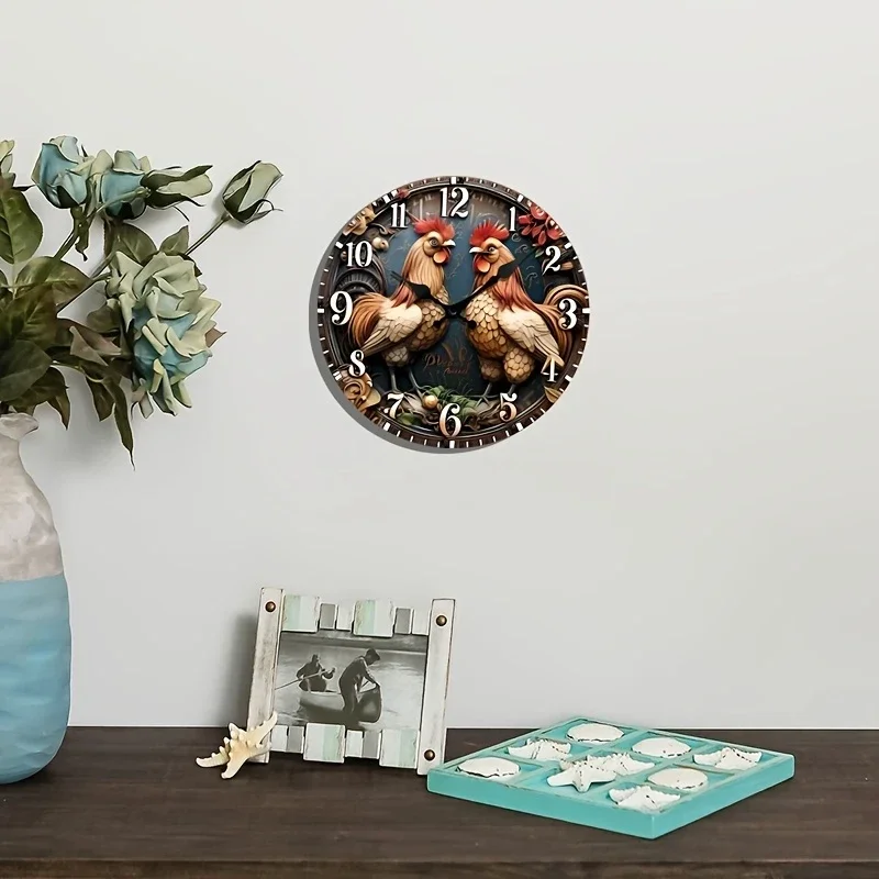 Charming Rooster-Themed Silent Wall Clock - Battery Operated, Wooden, Round, Digital Display - Perfect For Home Decor (AA Battery Not Included), The Perfect Gift For Mother'S Day And Wedding Season
